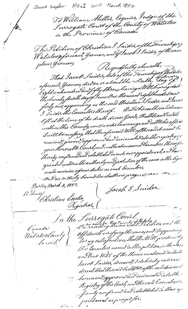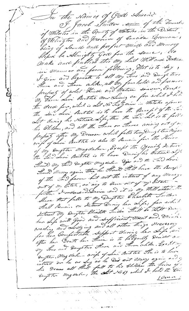 5, 1853. The Will transfers Lot 69, Waterloo Township to Levi Bechtel and his wife,