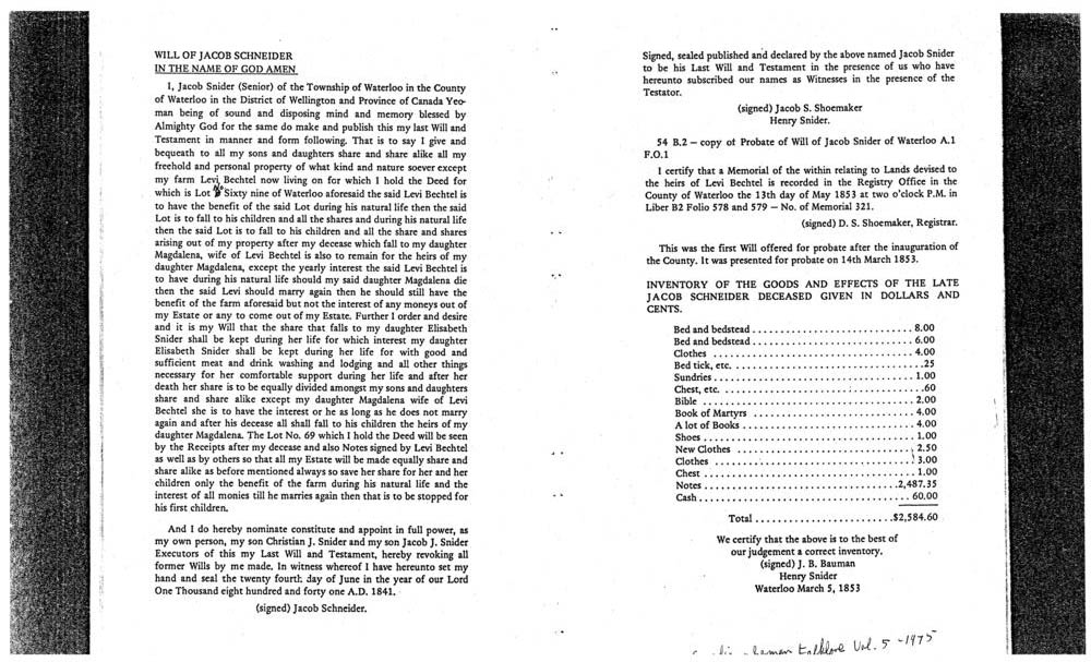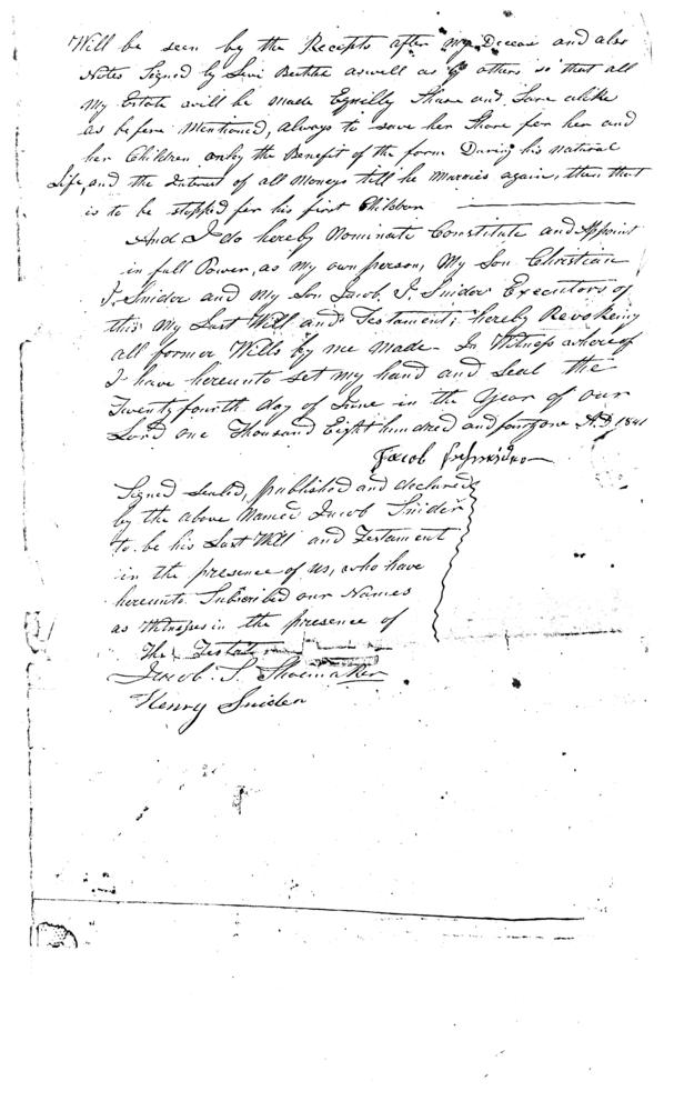 Copy of the Will of Jacob Schneider dated June 24, 1841 and presented for probate in