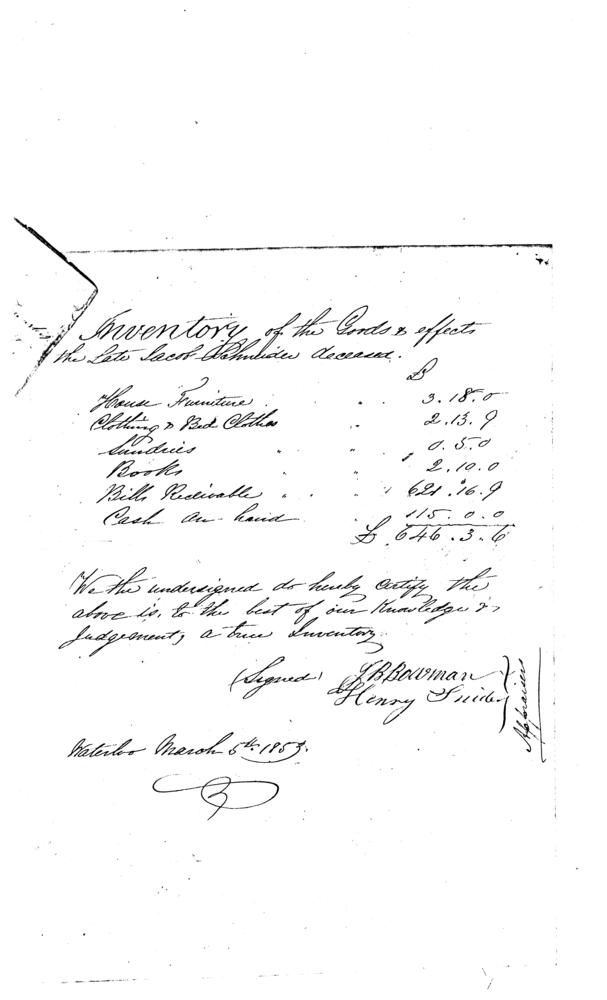 Waterloo County March 14, 1853. It includes an Inventory of Goods and Effects dated March