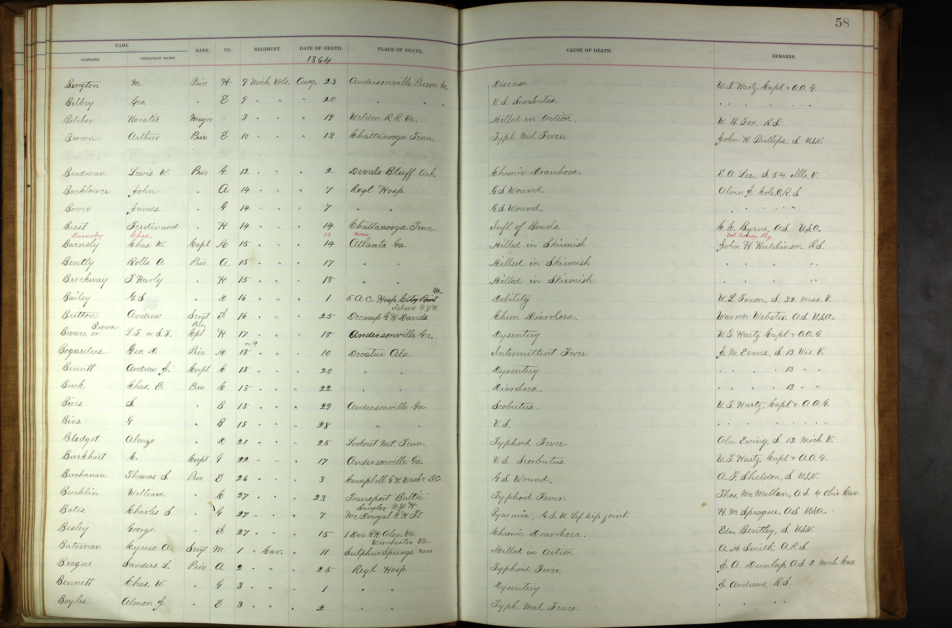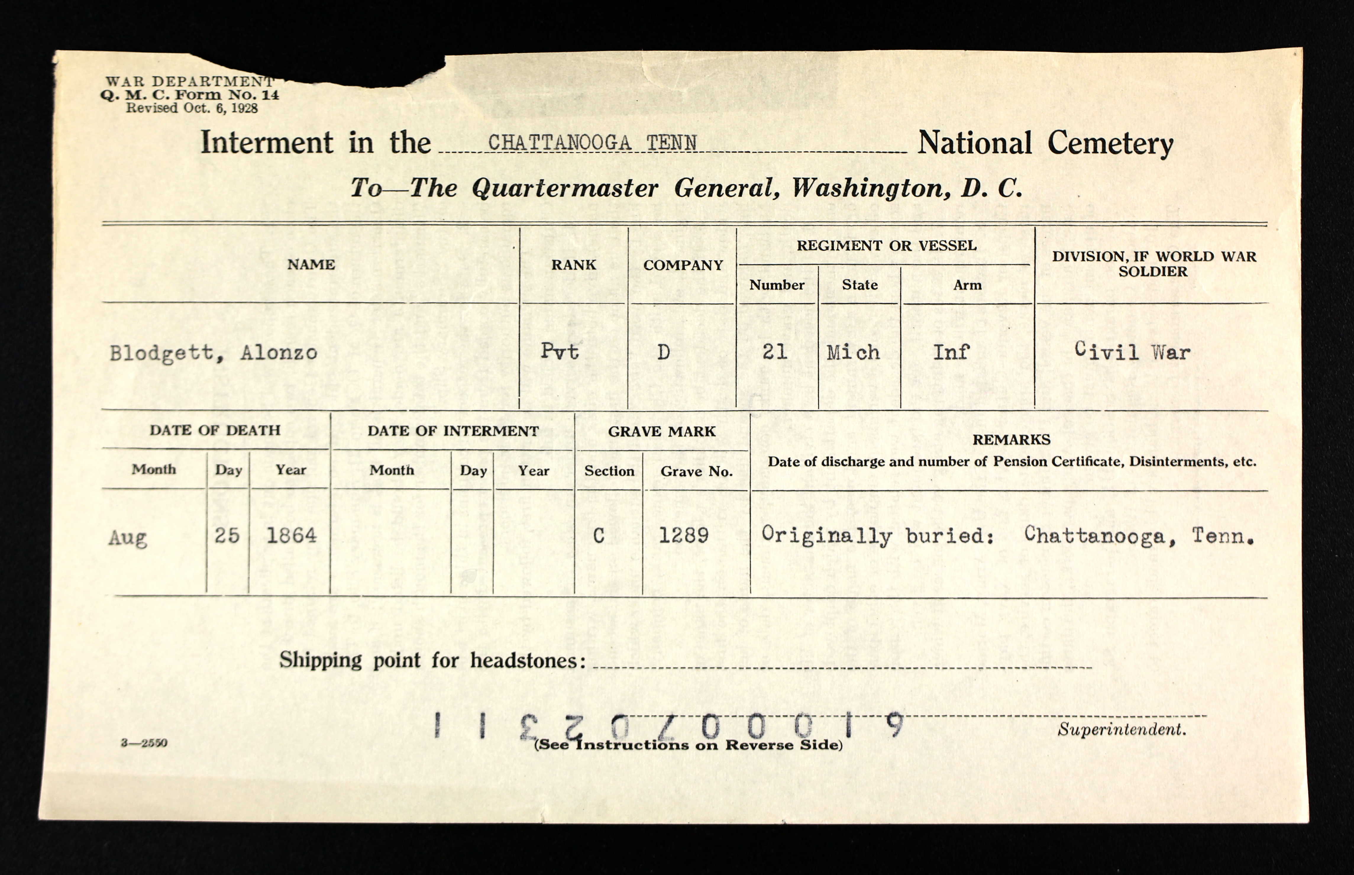 Note: Died of chronic diarrhea during the Civil War. Alonzo’s unit was assigned to the Engineers Corp during the summer of 1864 and was working around Chattanooga building bridges and hospital buildings. Alonzo died of chronic diarrhea on August 25th 1864. He was one of 279 men that died of disease in the 21st MI Inf. Personal Effects he had at time of death: hat, great coat, blouse, trousers, socks, 2 blankets, haversack, knapsack, clothing brush, silver ring, suspenders, $10.65 (a few more items I can’t quite read)…