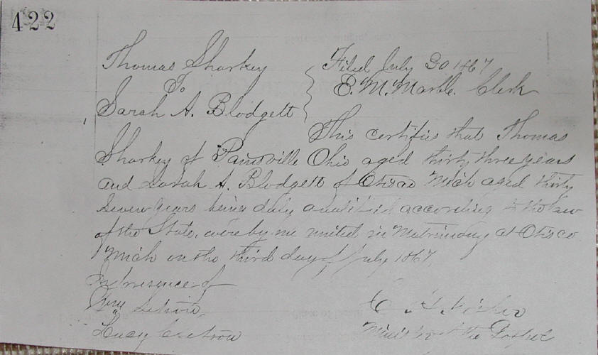 Note: Thomas Sharky marries Mrs. Sarah A. Blodgett