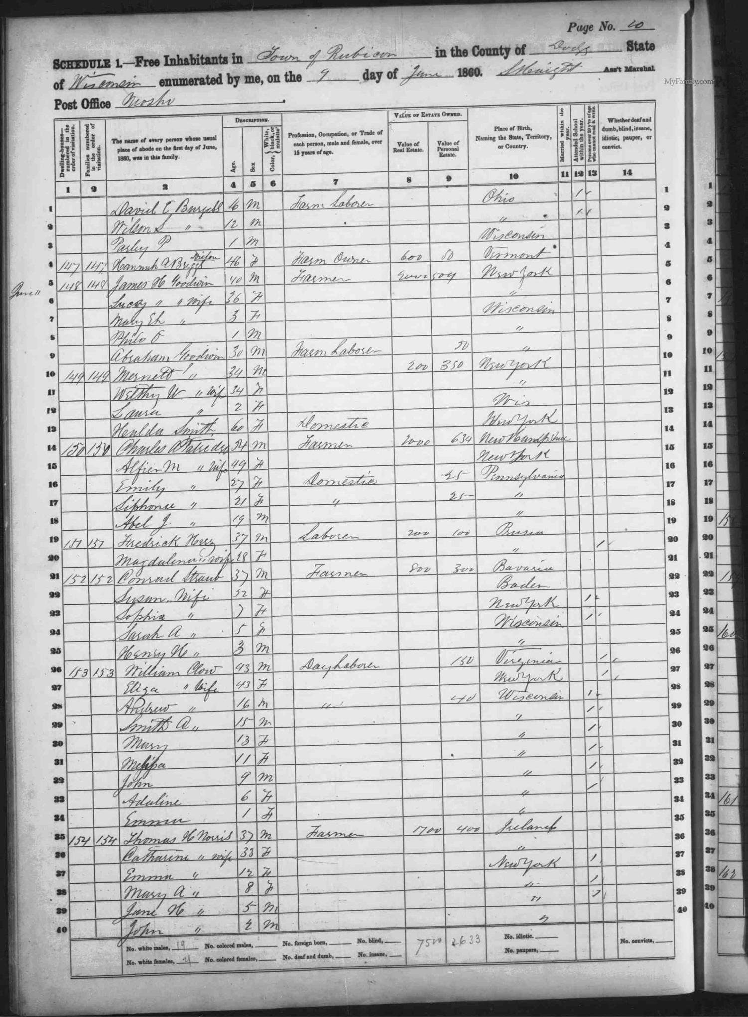 Note: Living with son-in-law and daughter, B.M. Goodwin and Welthy. Name listed as Huldah. There is a Reuben Smith living a few doors down. Could possibly be related? (Pic of Burnett M. Goodwin, Huldah’s son-in-law, on the right)