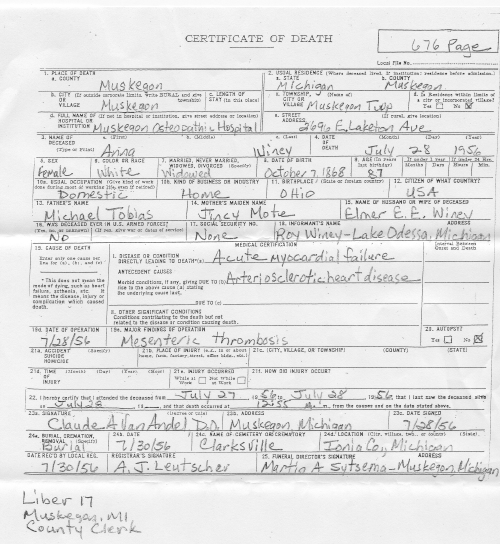 Death: 28 JUL 1956 Osteopathic Hospital, Muskegon, Michigan