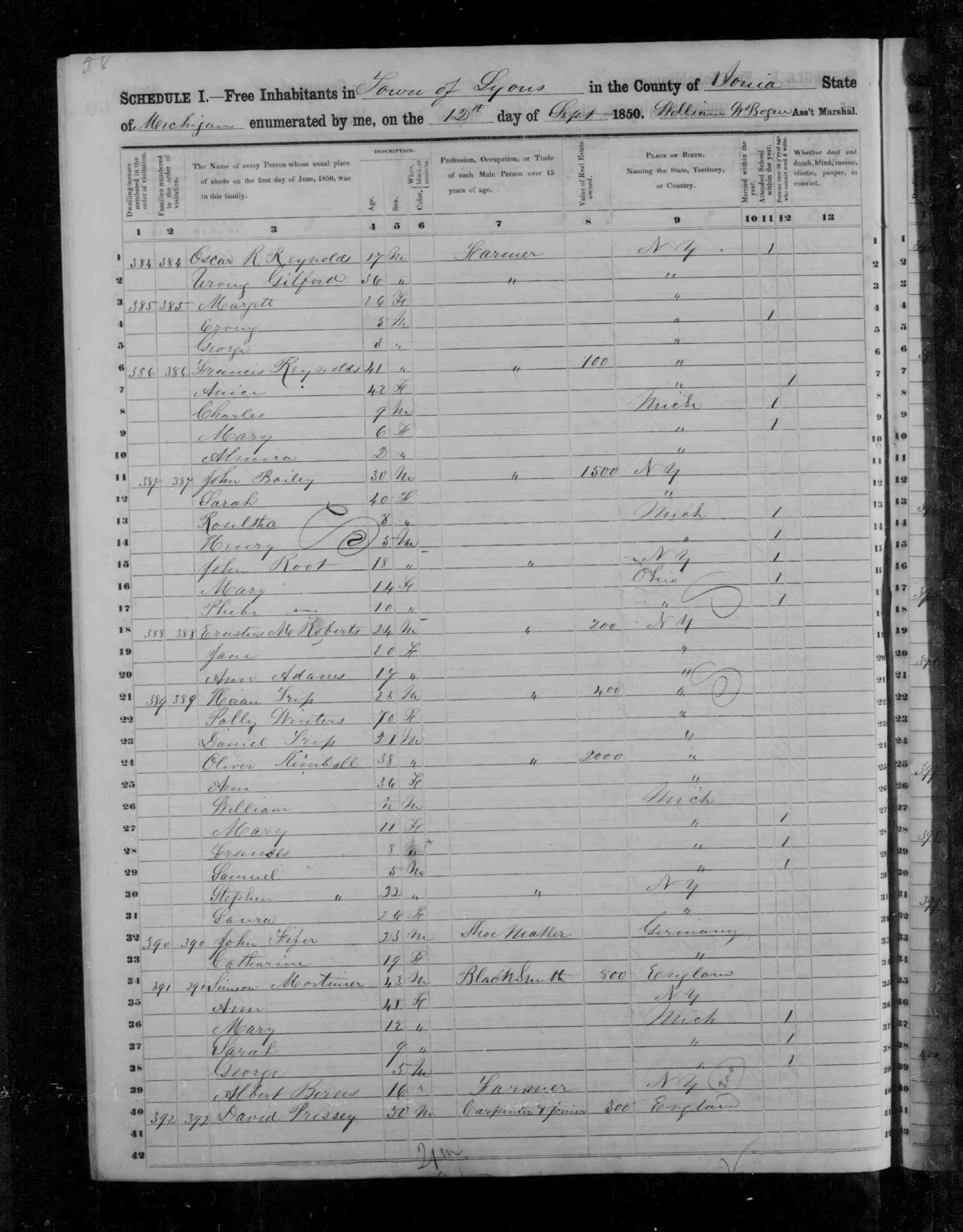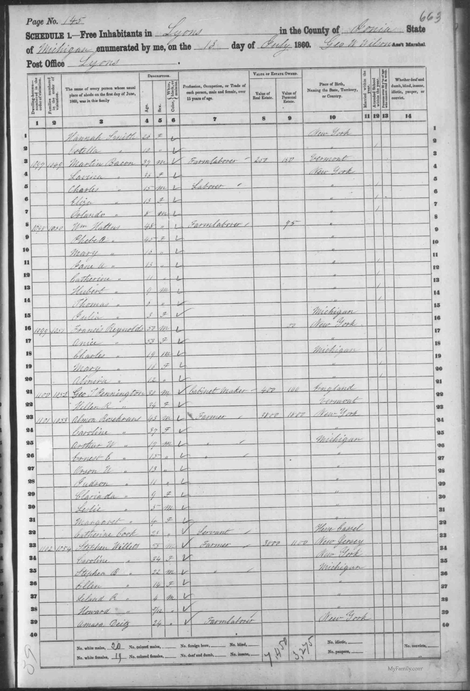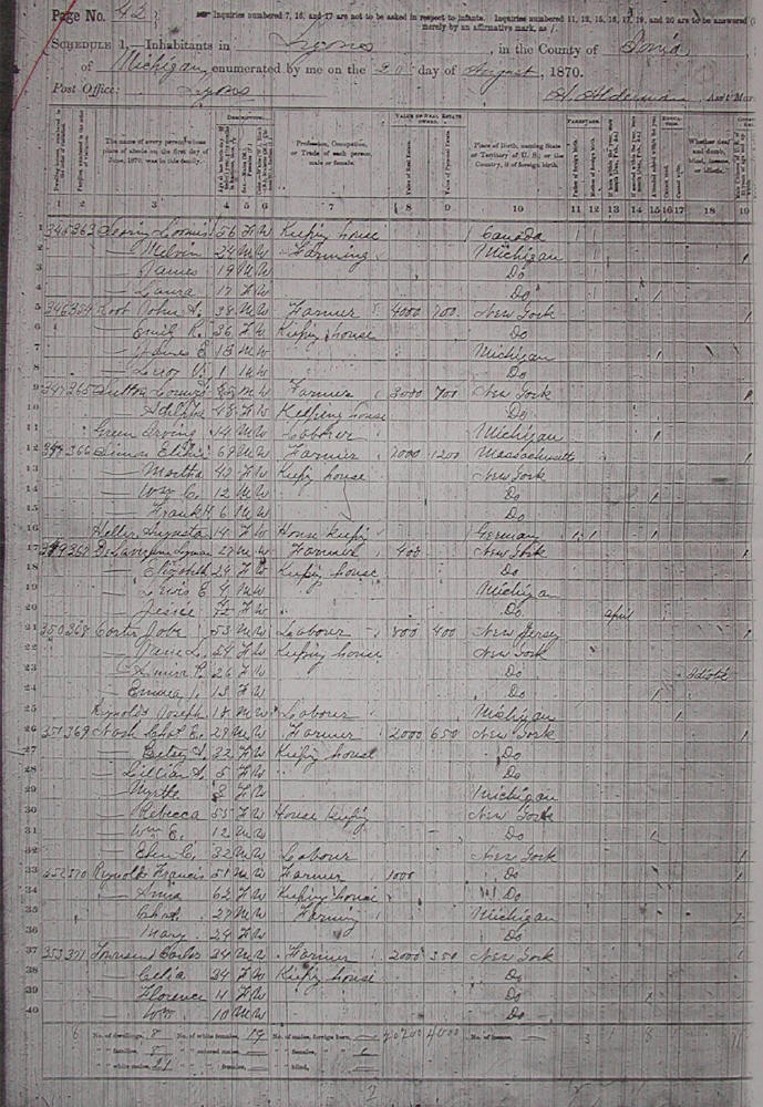 The 1850 U.S. Census shows Francis and Anice in Lyons Township, Ionia County, Michigan, with their three children. Like many in that frontier farming community, Francis worked as a farmer, an occupation he would pursue faithfully between 1850 and 1870. Census records over those decades continue to show him living in Lyons with Anice, raising their family and cultivating their land.