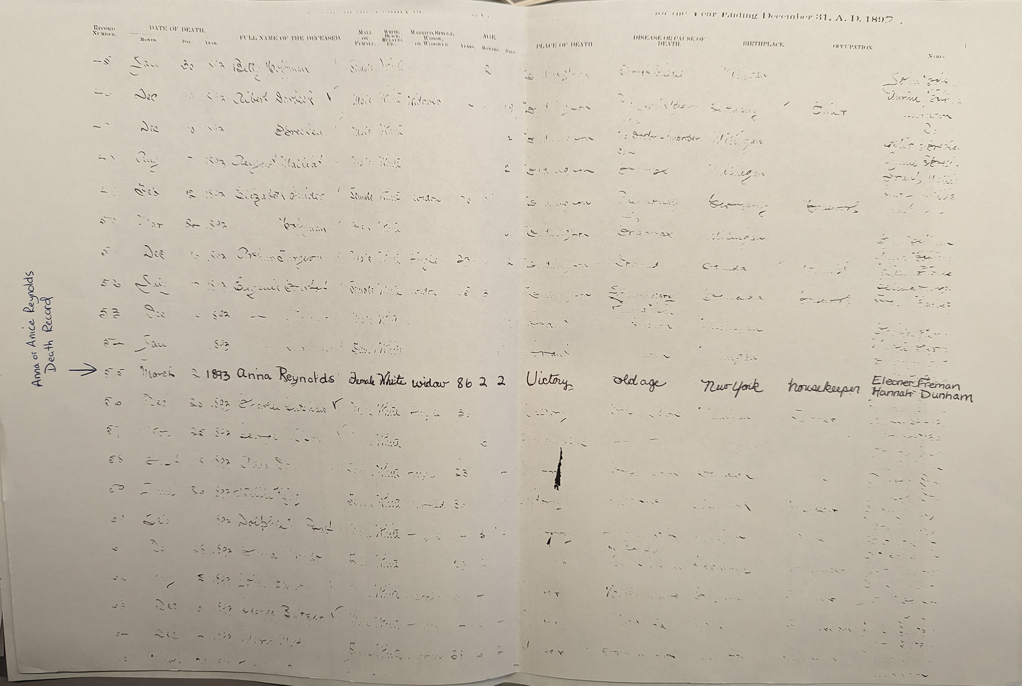 On March 2, 1893, Anice died in Victory Township, Mason County, Michigan. Her death return, dated May 18, 1894, notes her occupation as “housekeeper” and records her passing from old age. She was buried in North Victory Cemetery, alongside her daughter Mary Reynolds Smith and son-in-law Cornelius Smith, a quiet resting place that keeps her near family in death, just as she had devoted her life to them in life.