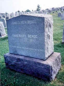 John Ulrich Bergey and his wife Mary are buried at the Salford Mennonite Meeting House. Their graves were marked with field stones until July, 1907, when a granite monument was erected on the spot by the Bergey family association, and unveiled with appropriate ceremony 27 September, 1907.