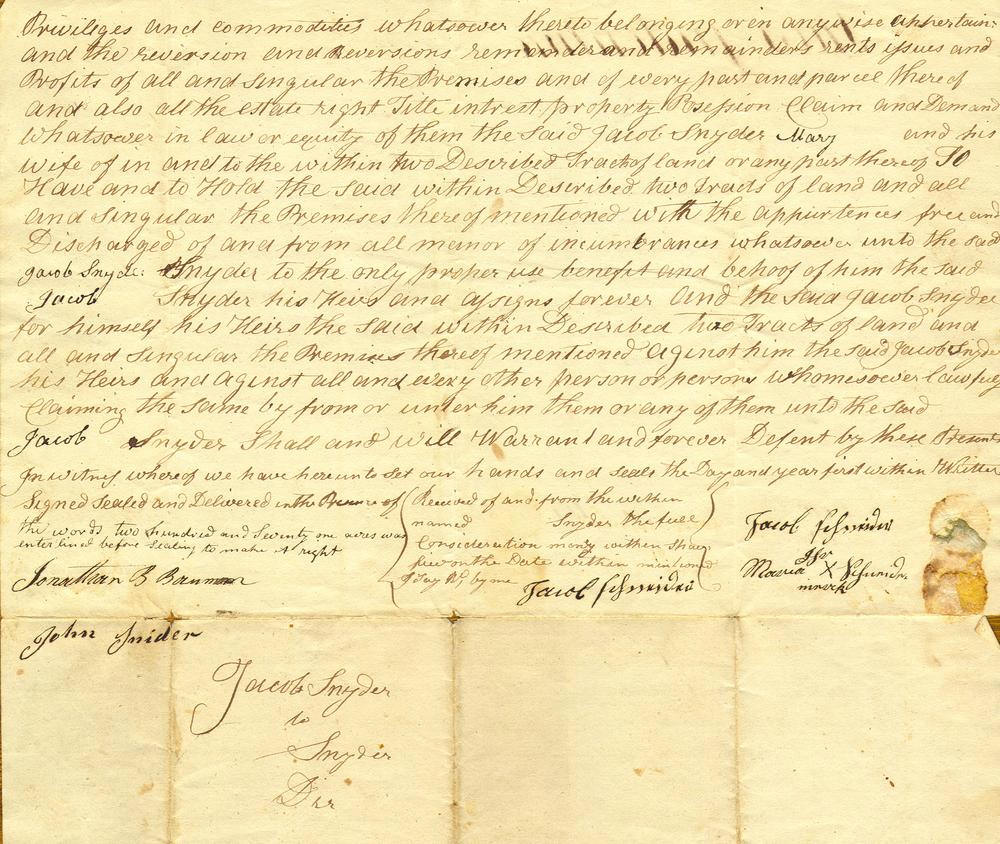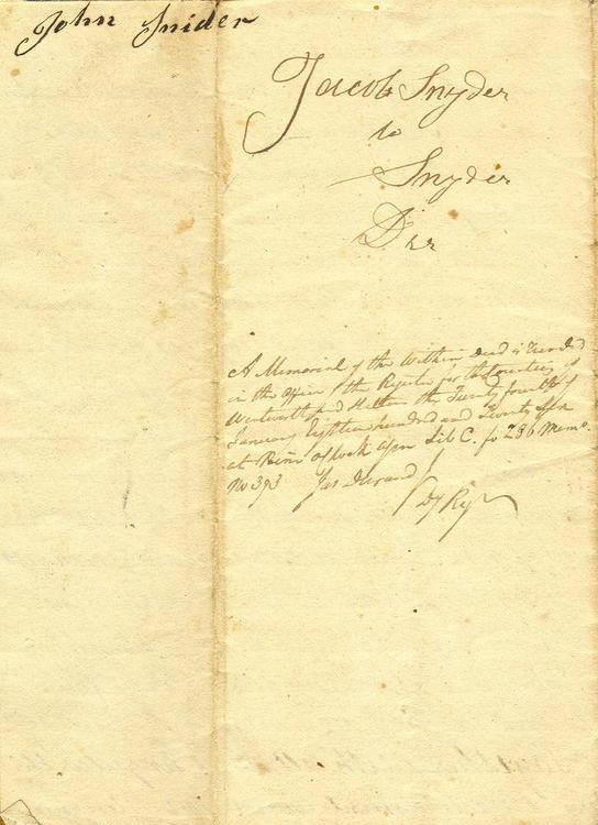 Note: A deed (Memorial No. 393) dated June 17, 1819 between Jacob Snyder Sr., Waterloo Township, Yeoman; his wife, Mary; and his son, Jacob Snyder, farmer. It refers to the sale of Lot 6 Waterloo Township, originally owned and sold by Richard Beasley to Israel Reid, and Lot 7 Waterloo Township, originally owned and sold by Richard Beasley to George Clemens who sold it to John Bricker. The Lots, consisting of over 217 acres, were sold for $1600. The document was witnessed by Jonathan B. Baumann and John Snider.