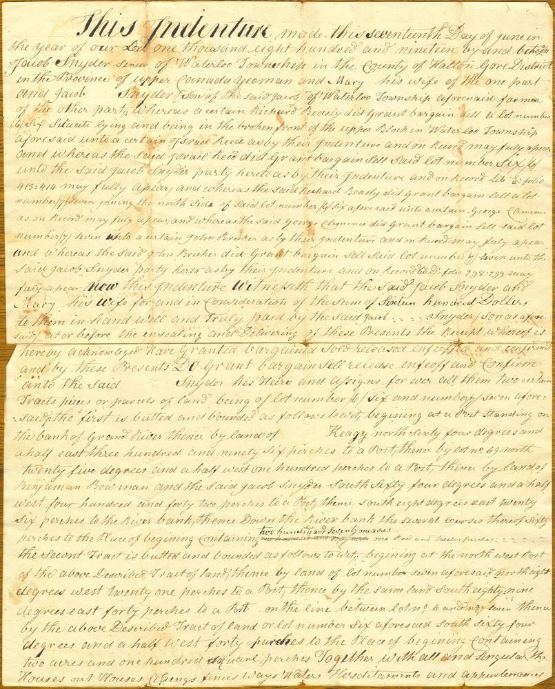 Note: Deed 9 dated June 18, 1839 between Jacob Shantz Jr., Waterloo Township, yeoman, and Jacob Snider Sr., Waterloo Township, yeoman. Sixteen acres, Lot 69 Waterloo Township was sold. The document was witnessed by Jacob J. Snider and Abraham Snider. The Deed was registered March 7, 1853.