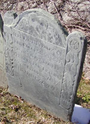 Inscription Reads: Here lyeth ye body of John Coggeshall Senr Esq., who deceased President of this Colony ye 27th of Novembr 1647 aged about 56 years