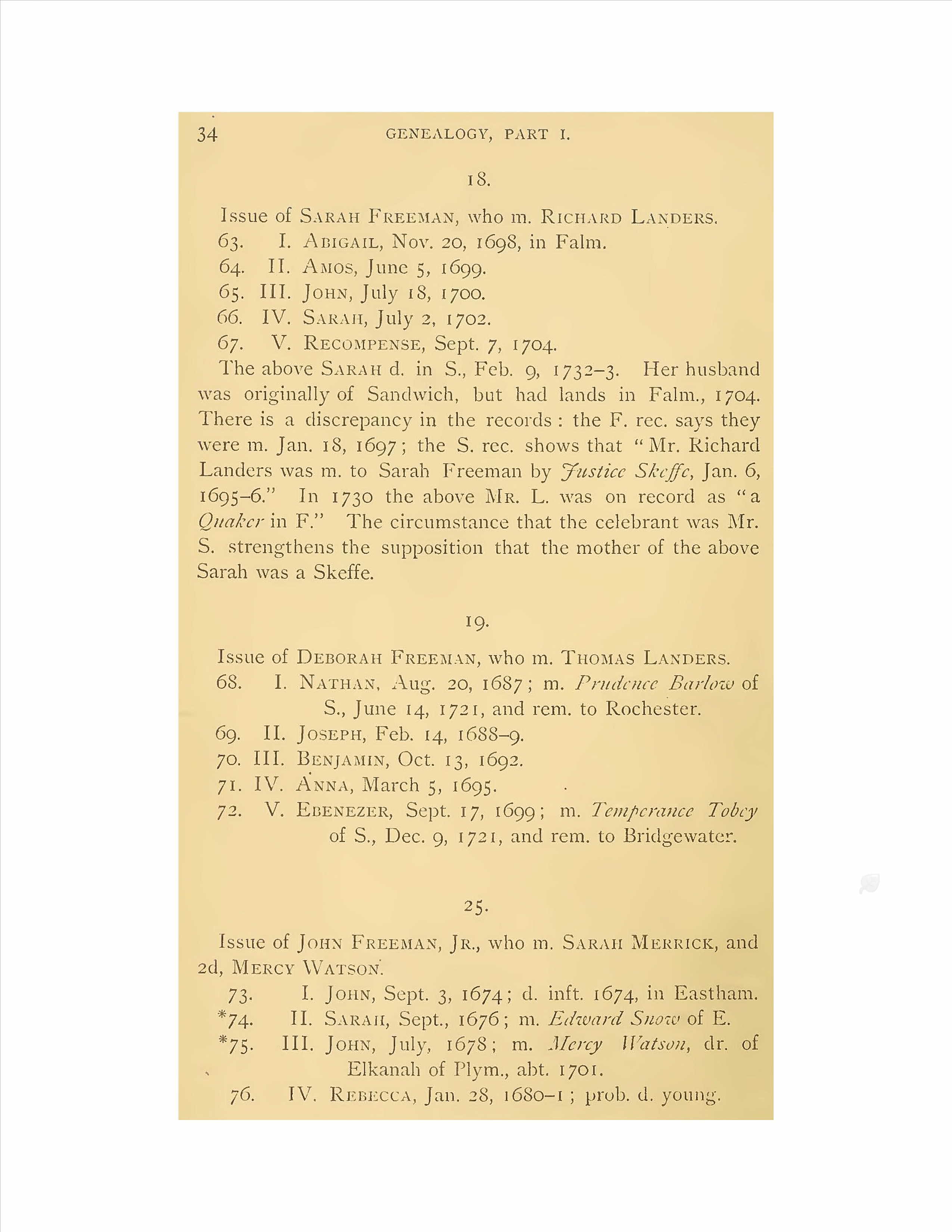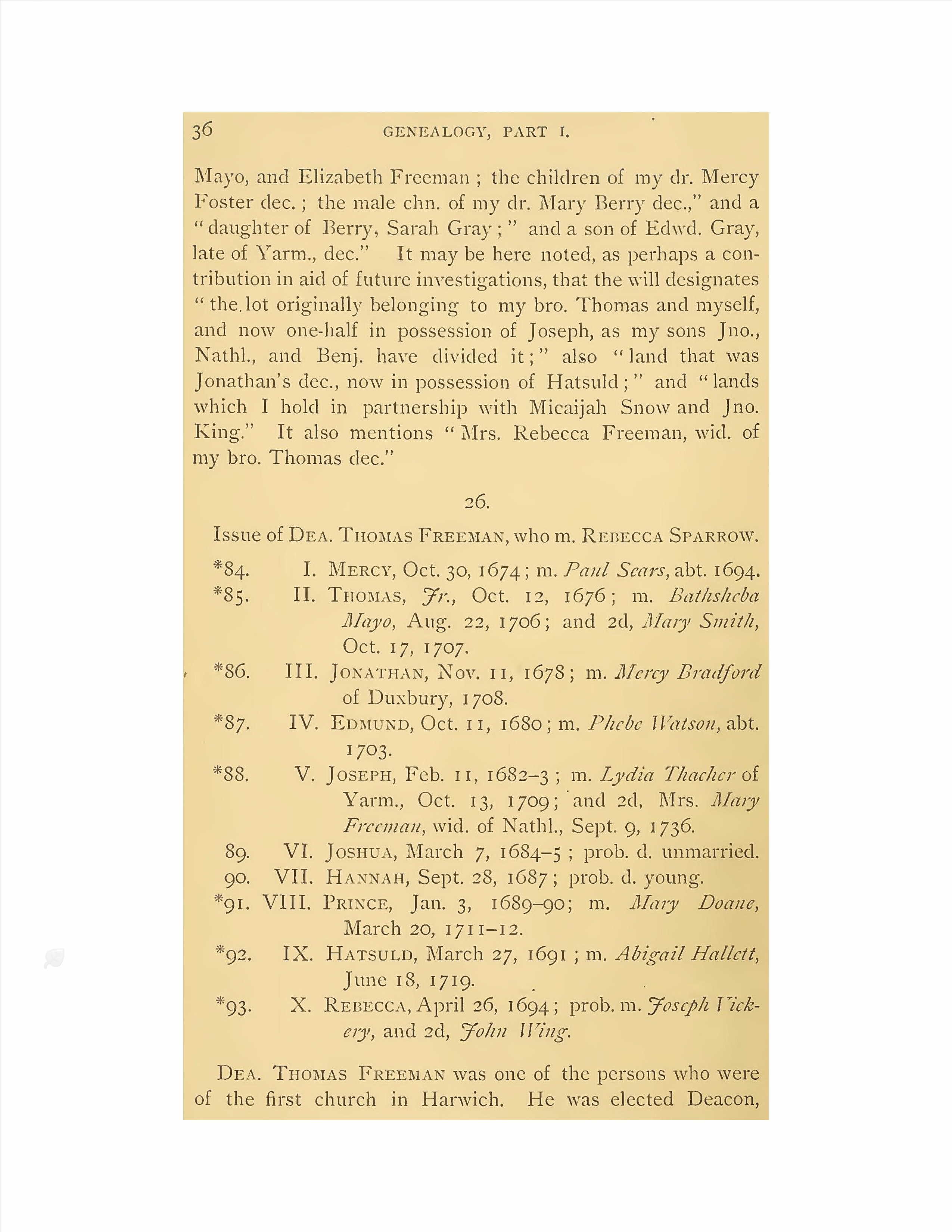 It may be noted, as perhaps a contribution in aid of future investigations, that the will designates “the lot originally belonging to my brother Thomas and myself, and now one-half in possession of Joseph, as my sons John, Nathaniel, and Benjamin have divided it” also “land that was Jonathan’s descendants, now in possession of Hatsuld” and “lands which I hold in partnership with Micaijah Snow and John King.” It also mentions “Mrs. Rebecca Freeman, widow of my brother Thomas, deceased.”