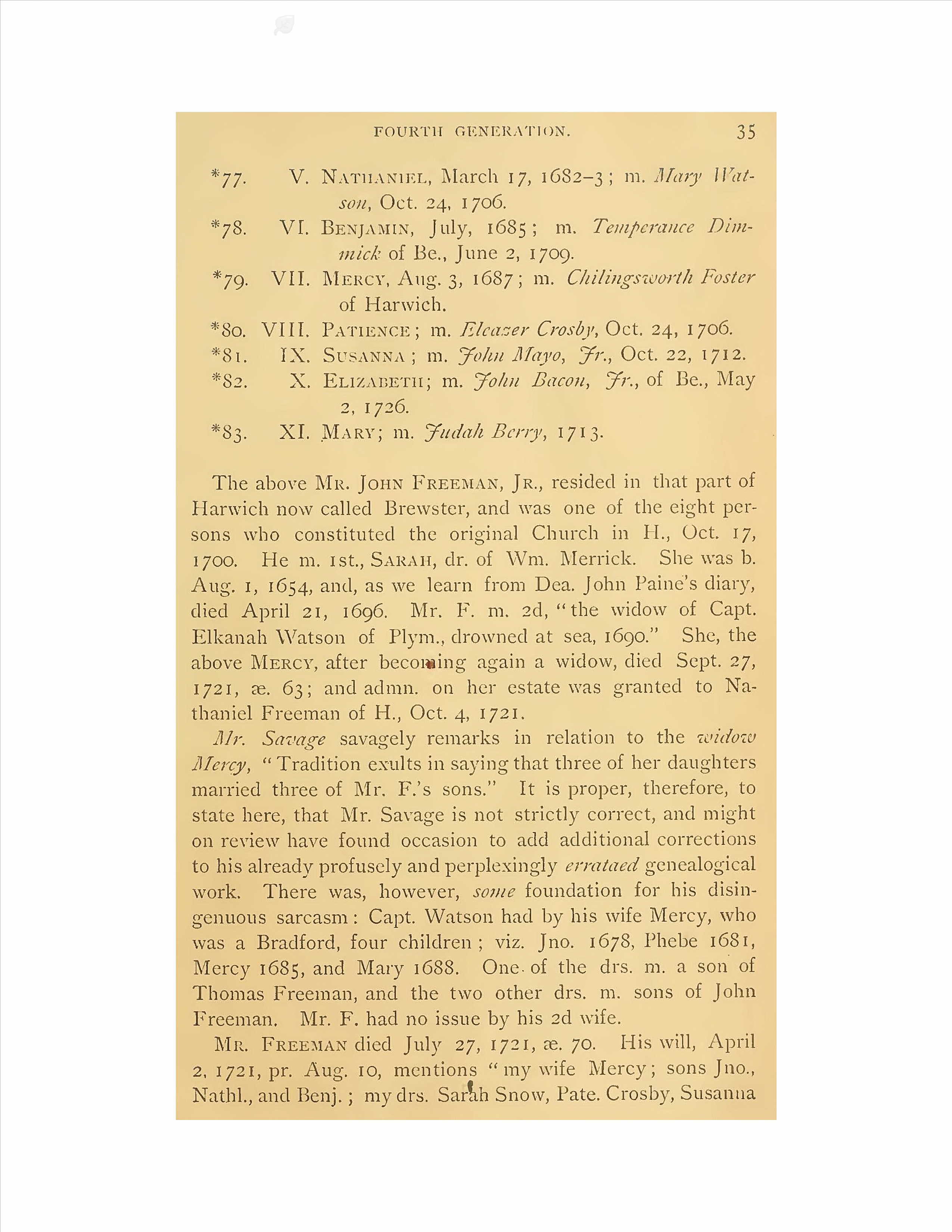 Note: Mentions “my wife Mercy, sons John, Nathaniel, and Benjamin, my daughters Sarah Snow, Pate. Crosby, Susanna Mayo, and Elizabeth Freeman, the children of my daughter Mercy Foster dec., the male children of my daughter Mary Berry deceased” and a “daughter of Berry, Sarah Gray” and a son of Edward Gray, late of Yarm deceased.”