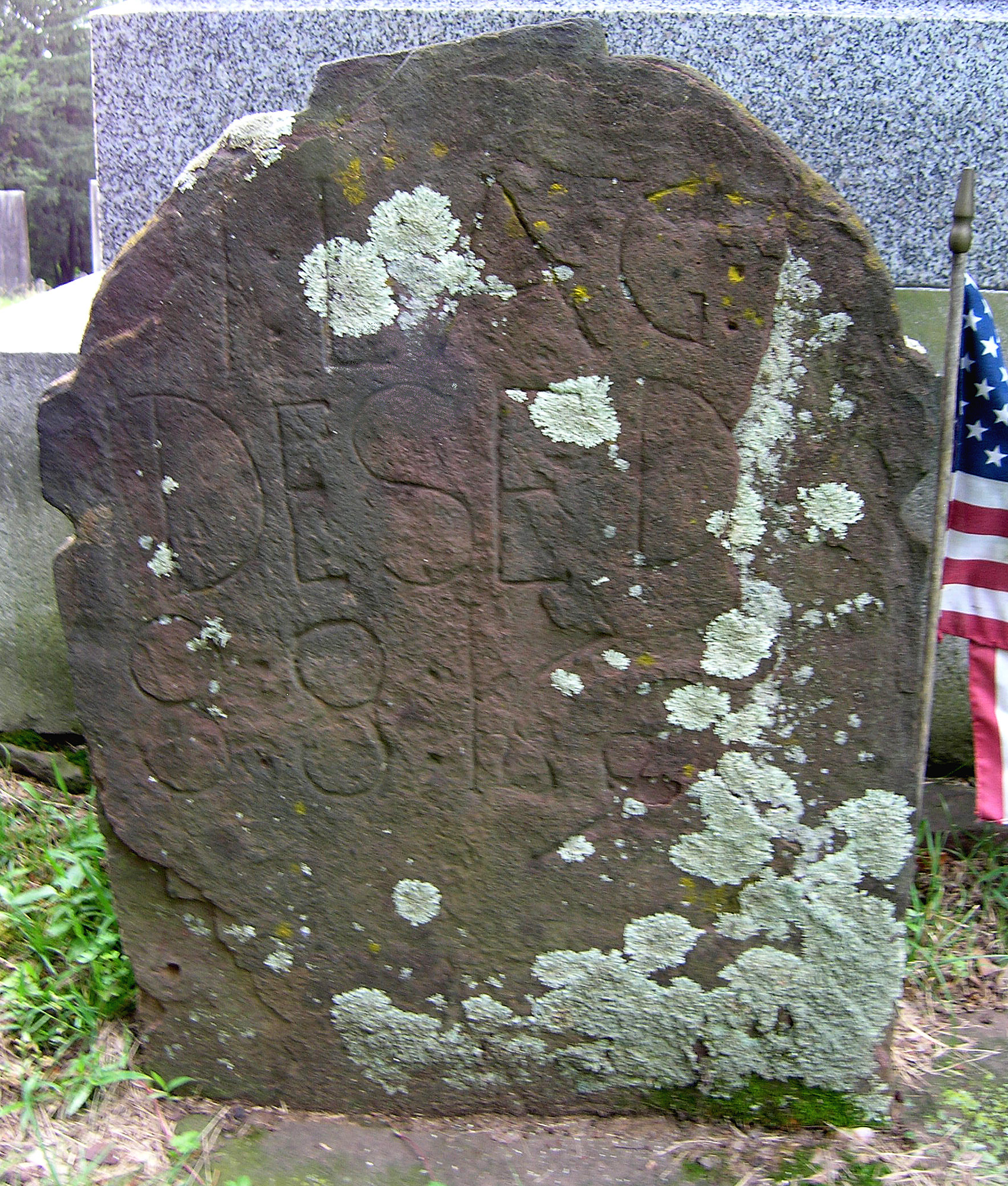 Note: Our ancestor died Aug. 8, 1690 (old style), and was buried in the old cemetery at Farmington, and his grave was designated by the usual headstone of that day, but which in the course of time disappeared, no one of the present generation being able to account for it. A few years since, however, it was brought to light through the efforts of Rev. Samuel Lee of New Ipswich, N. H.—it having sunken into the soil out of sight. It is a coarse, unhewn slab,20×29 inches in dimensions,the lettering being rough and jagged as the slab itself.