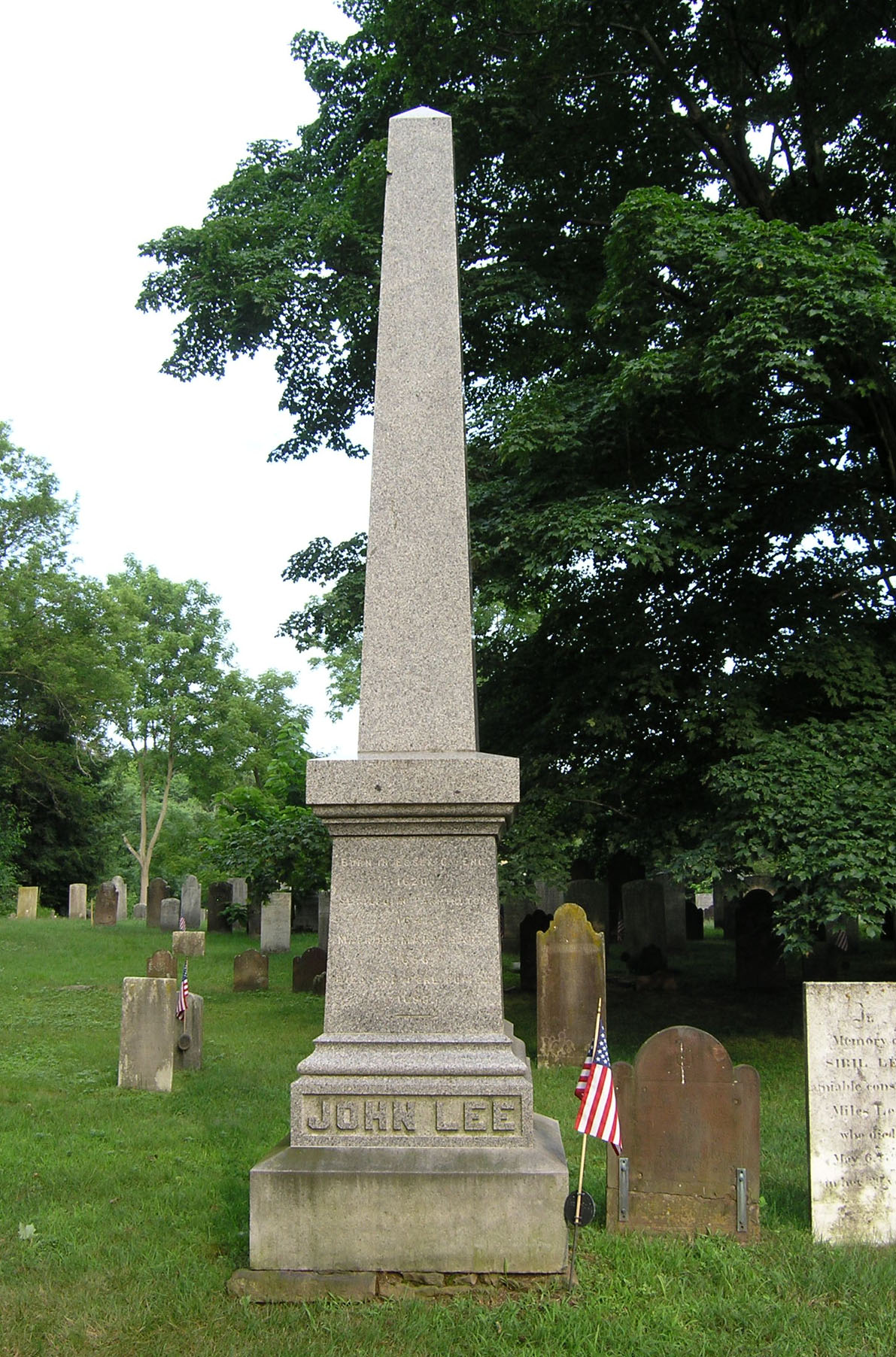 William H. Lee of New York, a native of New Britain—with a generosity worthy the name he bore—had a beautiful monument erected in its place “executed in Glasgow, Scotland. It is of dark gray Scotch granite, highly polished, standing seventeen feet high, upon a base four feet square. The inscription on the old stone has been carefully reproduced on one side of the monument. The name JOHN LEE in large block letters on the base is surmounted by the die, upon which are the inscriptions, and above which is the main shaft of obelisk proportions.”