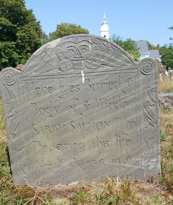 Her tombstone reads “Here Lyes Body of ye Widow Sarah Salmon Who Departed This Life Novbr 3rd in ye…”, the remainder of her tombstone is submerged in the earth.
