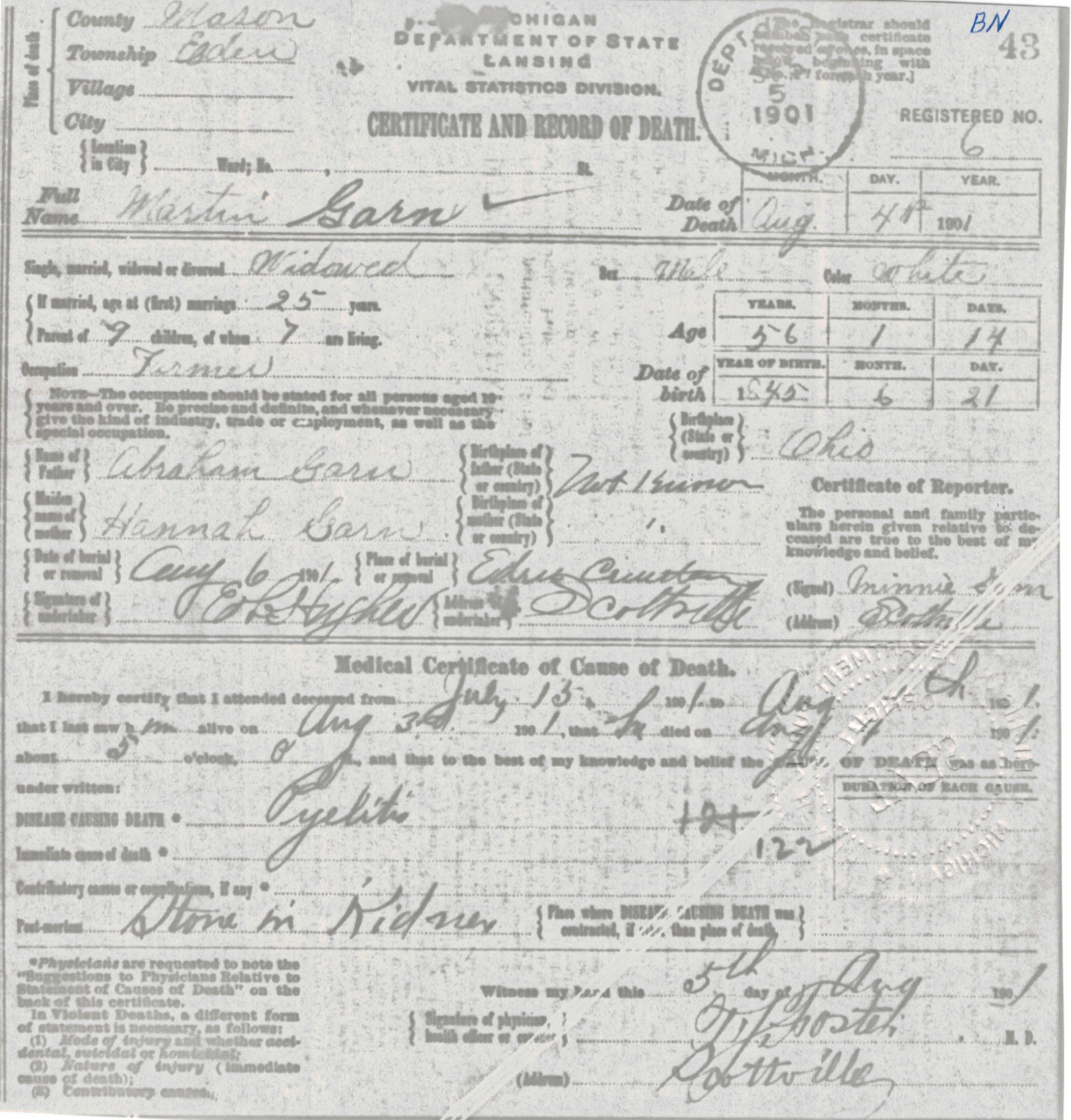 Death: 06 JUN 1892 Eden, Mason, Michigan, USA