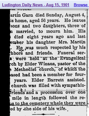 Note: Sarah Jane Garn was born in Indiana & married Martin Garn Sept 1, 1870. She died June 6, 1892 at age 43. They moved to Wexford County in the Spring of 1885, and in April 1892 moved to Eden Mi. In April 1888 while Bro. L. P. Lawton was holding a revival meeting at the Dayhuff school house, the Holy Spirit did his office work in conveting Bro. & Sis Garn. She held fast the profession of faith unto the end.