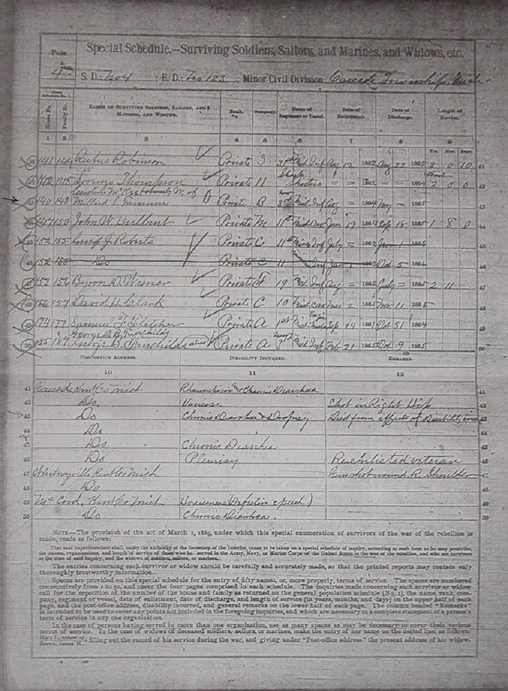 Note: Private, Company B, 3rd Michigan Infantry. Incurred the disability of chronic diarrhea and dropsey. He died from the effects of the disability incurred. Have Millard’s civil war pension papers.