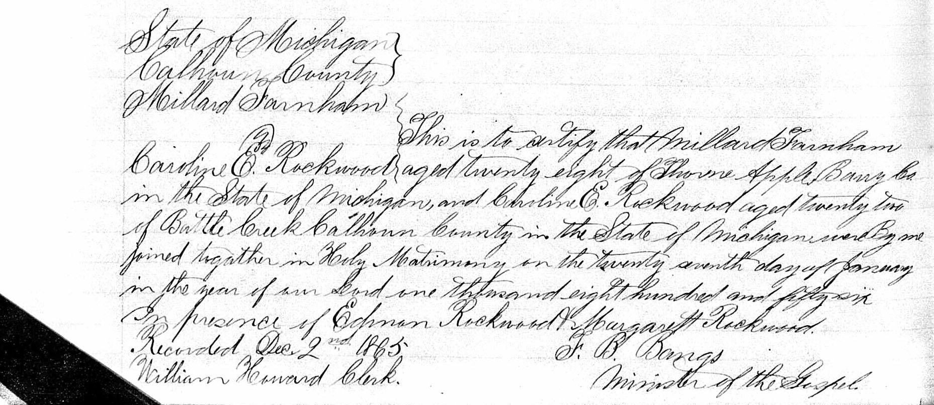 Note: Witnesses were Edmon Rockwood and Margarett Rockwood (relationship to bride is unknown so far)