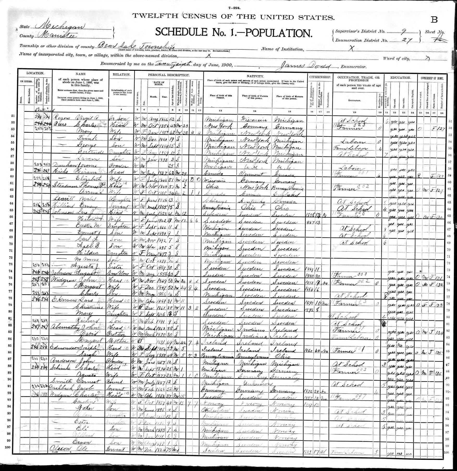 Upon settling in Michigan, Olof continued his life in the United States. In the 1900 U.S. Census, Olof was residing in Bear Lake Township, Manistee County, Michigan, living with Charles and Caroline Wedgren as a servant. At that time, he was noted to be able to read but could neither write nor speak English.