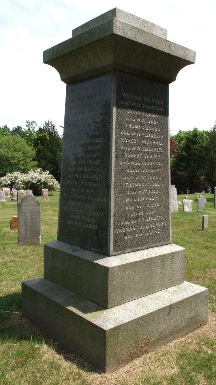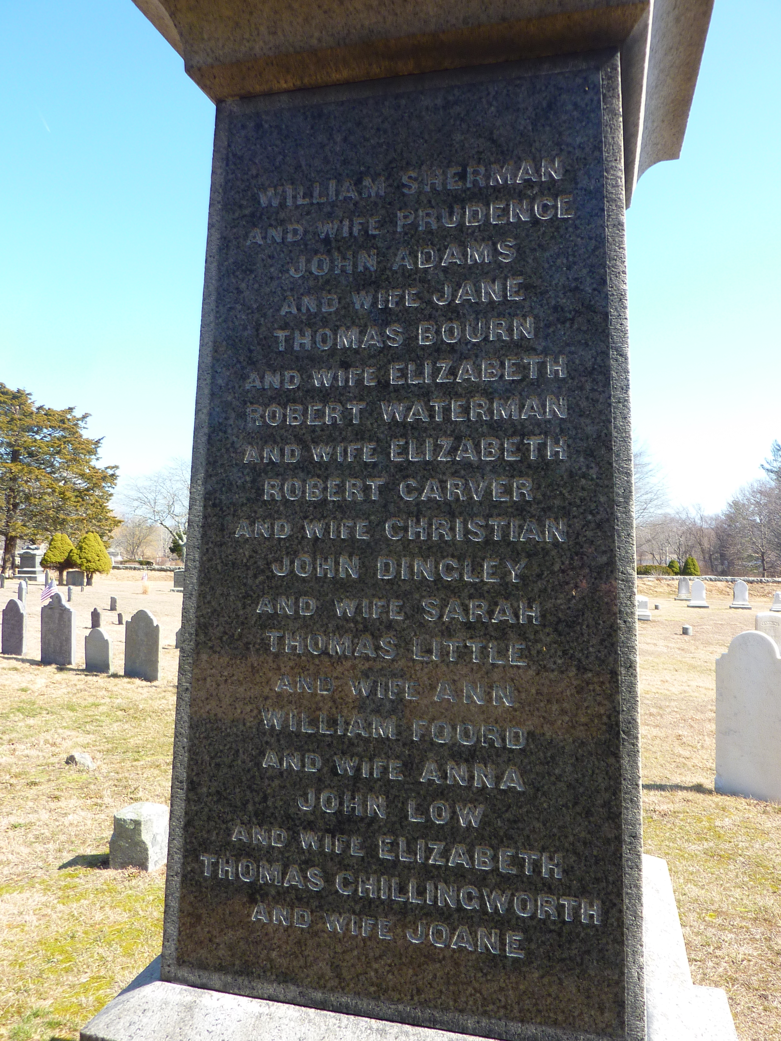 Details: While there is a cenotaph including Thomas Bourn’s name at the Old Winslow Burying Ground, there is no evidence that either Bourne was buried there. At this early time, most settlers were buried on their own land, often in burying grounds not locatable now. But given the fact that she died in New London, it is extremely unlikely that she was interred anywhere near Marshfield.