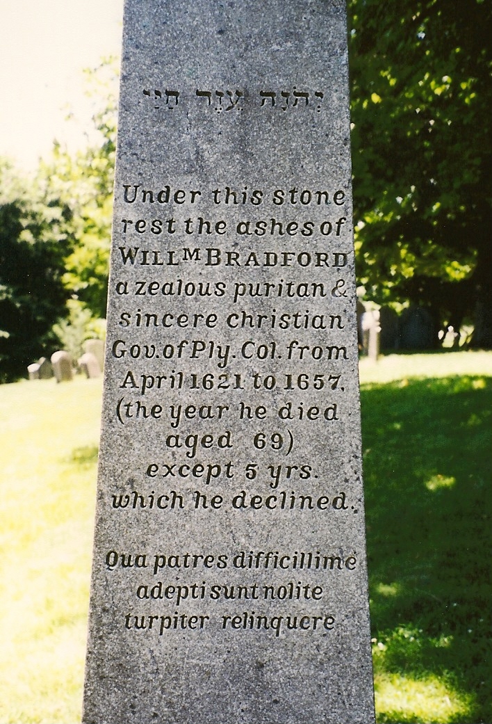Notes About William’s Life: Plymouth Colony Colonial Governor. He served in this capacity at different times for over 30 years, from 1621 to 1657. His journal, written from 1620 to 1647, and published as “Of Plymouth Plantation,” is credited as the first civil authority to designate what popular American culture now traditionally accepts as Thanksgiving in the US. He is considered by historians to be one of the most influential of the Pilgrim settlers for his outstanding leadership, his desire to steadfastly hold to his religious and moral ideals and his determination to keep Plymouth a thriving and independent colony. Born to a wealthy family, his early childhood was marked by numerous deaths, with his father dying when he was about a year old, followed by the death of his grandfather when he was six years old (with whom he lived after his mother remarried), and then the death of his mother when he was 7, after which he went to live with his uncles. He became interested in reading the Bible and classical literature. At age 12 he heard the sermon of a Puritan minister, Reverend Richard Clyfton, and was greatly inspired by his preaching. He soon joined the Puritan faith who met secretly at Scrooby Manor and in 1607 they severed ties with the traditional Church of England and became known as Separatists. The Separatists, or Puritans, were subject to religious persecution and many were either fined or imprisoned for religious disobedience. In 1607 the Scrooby congregation attempted to leave England and go to the Dutch Republic of the Netherlands, where freedom of religion was allowed, but they were betrayed by the English sea captain who had agreed to take them there and most of the congregation, including Bradford, were imprisoned for a short time. The following year he and the congregation managed to escape and settled at Amsterdam, in the Netherlands, where they had to work at low-paying jobs and live in poor conditions. Nine months later he moved with the congregation to Leiden, in an attempt to better themselves. In 1611 he was able to claim his family inheritance and his living conditions improved. He bought his own house and established a workshop as a fustian weaver, earning a reputable living. In 1617 the congregation made plans to relocate to America and establish their own colony in Virginia and in July 1620 and with Bradford’s assistance they secured financial backing in London to embark on their first journey to America with about 50 people, including Bradford and his wife, on the ship “Speedwell,” which was to meet up with the ship “Mayflower” that was transporting non-Separtists who had been recruited for their vocational skills. The “Speedwell” proved to be unsuitable to make the long voyage and its passengers were put aboard the “Mayflower” for its trip across the Atlantic Ocean. They left England in September 1620 and after two months of extremely harsh sailing conditions, they spotted land (Cape Cod Hook). Attempting to sail south to reach their final destination in the Colony of Virginia, the ship was rebuffed by strong winter seas and they were forced to return to Cape Cod Harbor. Bradford volunteered to be a member of the exploration party to find a suitable settlement location, eventually choosing present-day Plymouth, Massachusetts. When he returned to the ship with news of the settlement selection, he learned that his wife had died by falling overboard and drowning. Arriving in Plymouth Bay on December 20, 1620 the settlers disembarked and started building houses. By the following spring almost half of them died from disease. In April 1621 Bradford became governor of the Plymouth Colony upon the death of John Carver and would remain in that position for most of the remainder of his life. Through his perseverance he kept the Plymouth colony alive until his death in 1657 at the age of 67. (bio by: William Bjornstad)