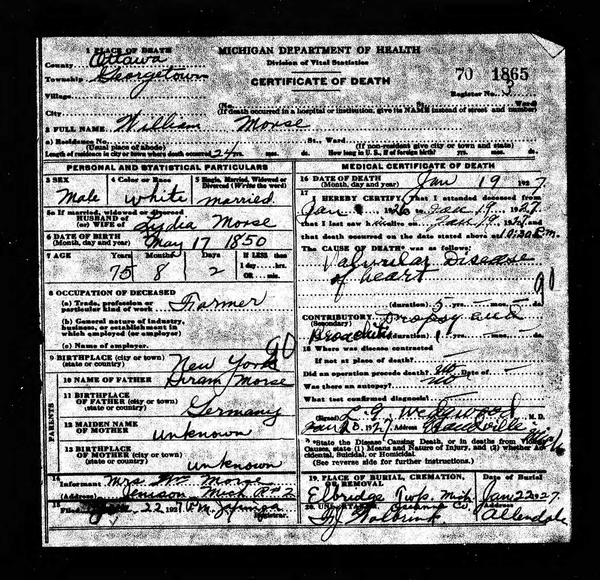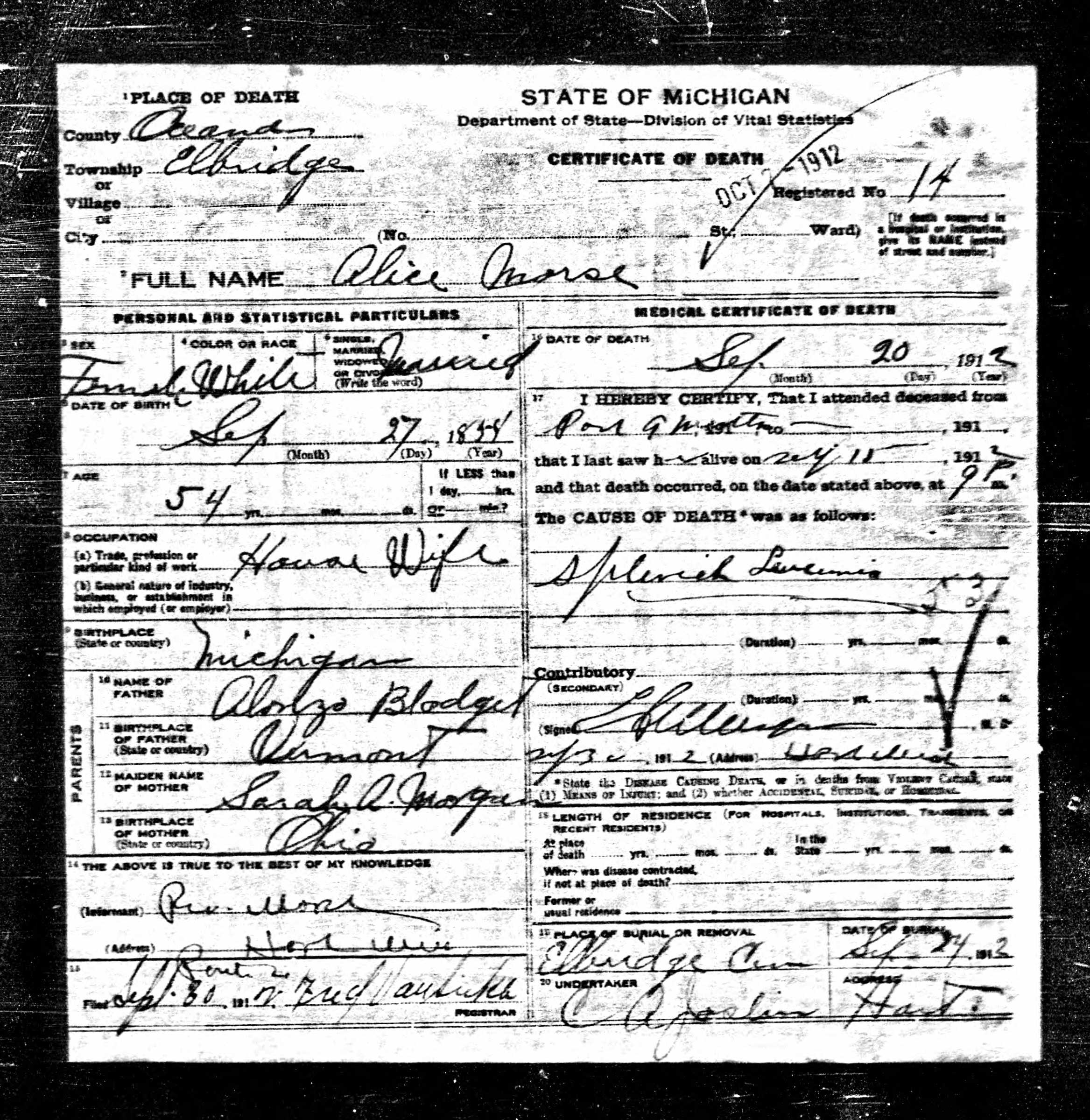 Obituary: Our minister’s wife, Mrs. Wm. F. Morse, died Friday evening, September 20, of cancer of the stomach. She leaves a husband, eight children, and friends to mourn her loss. Funeral services were held Tuesday afternoon in the Elbridge church, conducted by Elder C. S. Wright, and the remains laid to rest in the Elbridge cemetery.