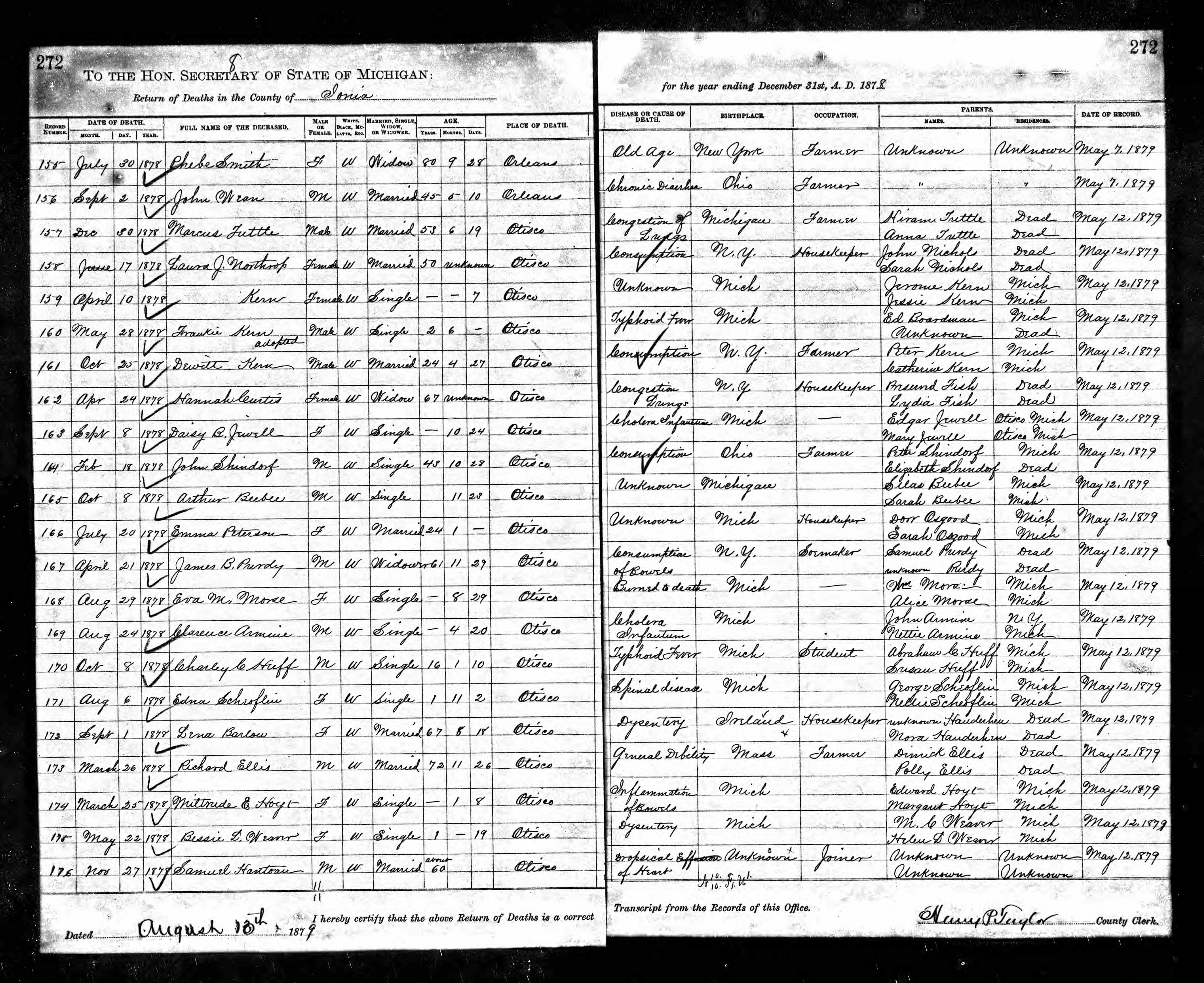 Note: Leland verified that William had been sent to a seminary by his father to become a priest. When William’s mother died, she made William’s father promise that he would allow the children to choose their own religion. Hiram was Catholic and Mary was Protestant. Hiram promised he would do so, but after Mary died he went back on his promise and sent William to the seminary. Evidently the nuns were very cruel to William. He then left the seminary, told off his father, and moved to Michigan. William did not actually attend college for the ministry, but back then you didn’t have to. If a person wanted to be a minister they could be ordained by a church, and Leland said William was ordained by the Methodist Church. And he had to apply to the State of Michigan and be registered by the State in order to legally perform marriage ceremonies. – Jean Dusenberry